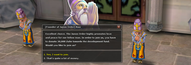 Similar to Clans, Unions are a community of allianced players. Unlike Clans, however, Unions are controlled by NPCs rather than players. There are four main Unions to choose from: Arumic, Ferrell Guild, Junon Order and the Righteous Crusaders. Each Union has a certain extent of authority on economy, politics, public orders, magic, arts, and religion. Each faction has its own alliances and hostilities, and different events can occur as a result of the complexity of the relationships between factions.